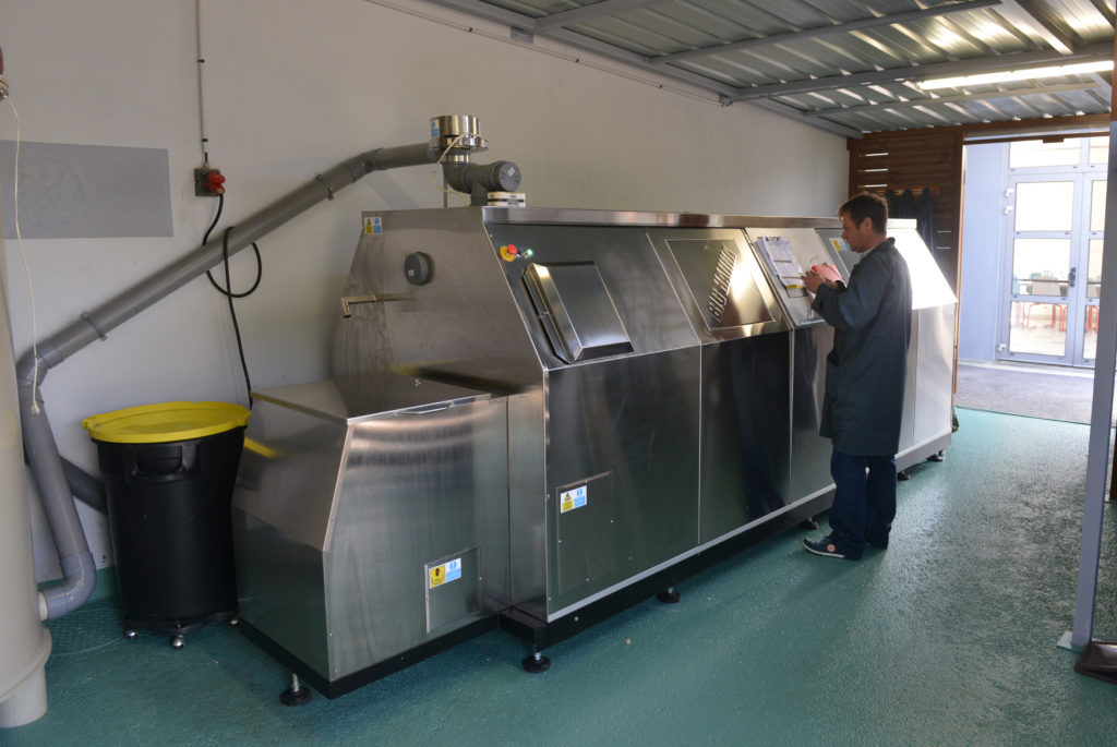 Cet équipement automatisé permet de composter une grande quantité de biodéchets (600kg par semaine) en un minimum de place (cylindre de 4m3) et de temps (8 semaines). Le composteur est constitué d’une trémie d’alimentation, qui permet d’introduire automatiquement les biodéchets, et d’un tube en inox de 3 mètres de long; ce dernier tourne régulièrement (10 à 20 minutes/jour) afin de brasser les biodéchets et favoriser l’aération.