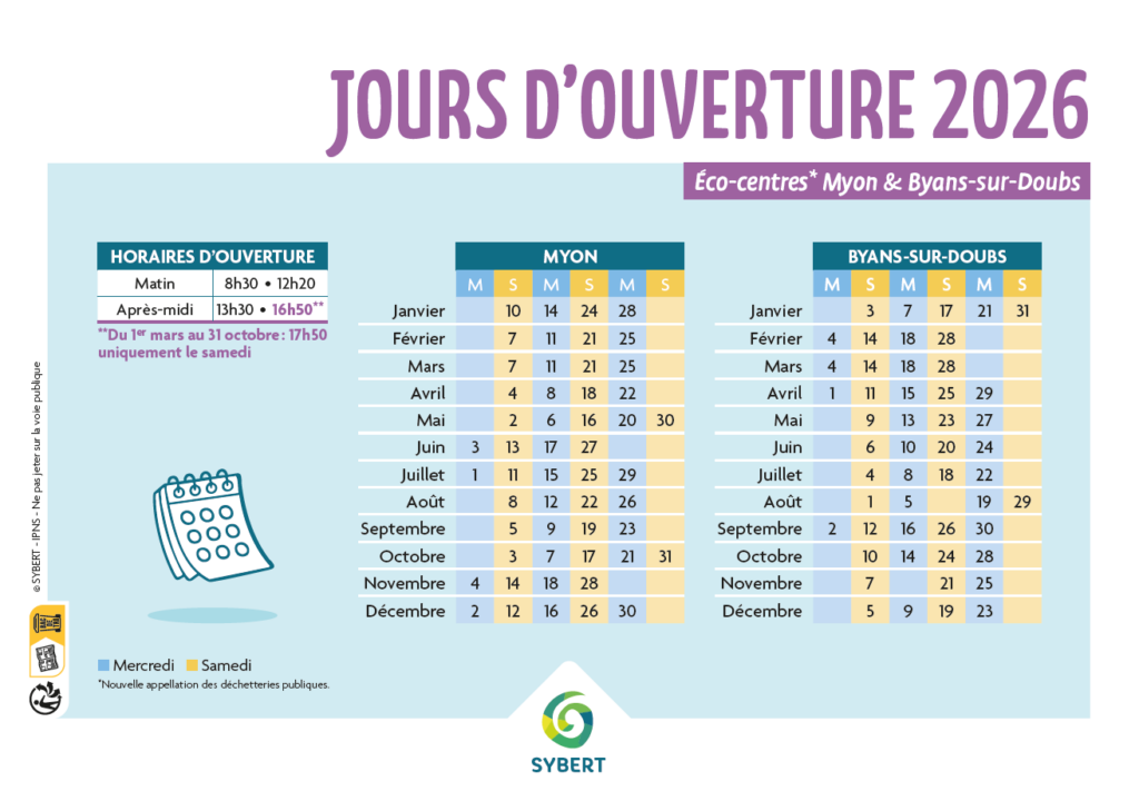Depuis le 1er janvier 2024, les éco-centres de Byans-sur-Doubs et de Myon sont ouverts un mercredi et un samedi sur deux, de manière alternée aux horaires indiqués ci-dessus.
